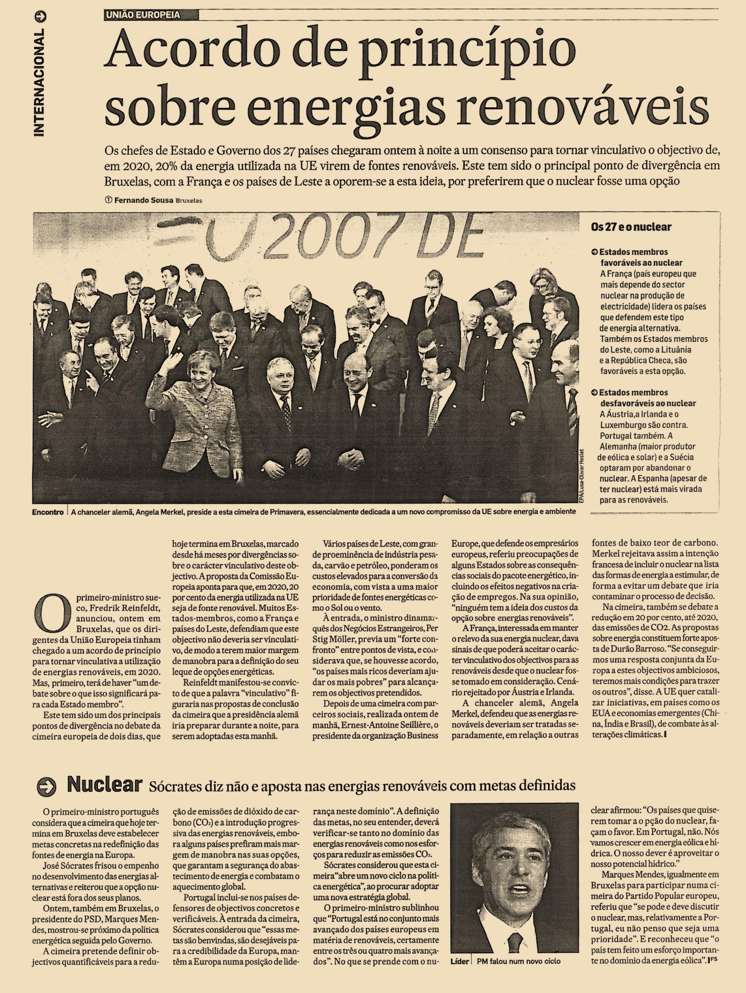 Os chefes de Estado e Governo dos 27 países chegaram ontem à noite a um consenso para tornar vinculativo o objectivo de em 2020, 20% da energia utilizada na EU virem de fontes renováveis. Este tem sido o principal ponto de divergência em Bruxelas, com a França e os países de Leste a oporem-se a esta ideia, por preferirem que o nuclear fosse uma opção.