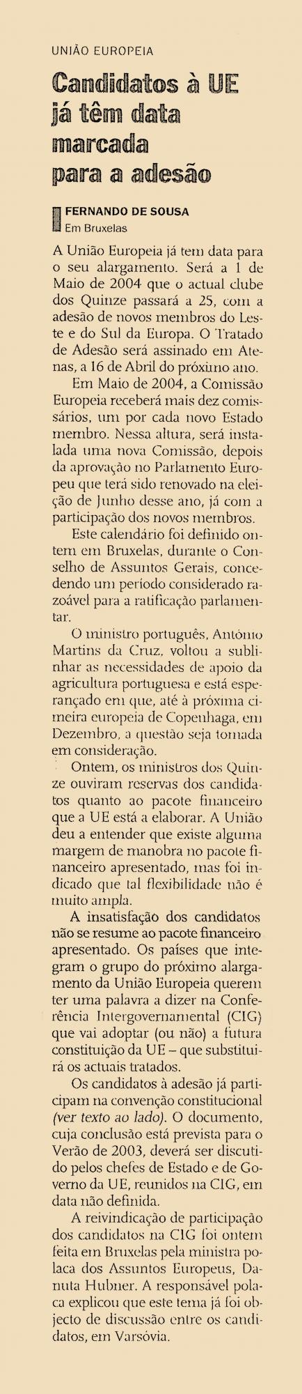 A União Europeia já tem data para o seu alargamento. Será a 1 de Maio de 2004 que o actual clube dos Quinze passará a 25, com a adesão de novos membros do Leste e do Sul da Europa. O Tratado de Adesão será assinado em Atenas, a 16 de Abril do próximo ano.