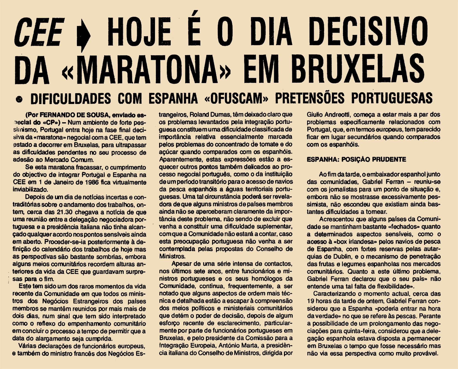 Num ambiente de forte pessimismo, Portugal entra hoje na fase final decisiva da “maratona” negocial com a CEE, que tem estado a decorrer em Bruxelas, para ultrapassar as dificuldades pendentes no seu processo de adesão ao Mercado Comum.
