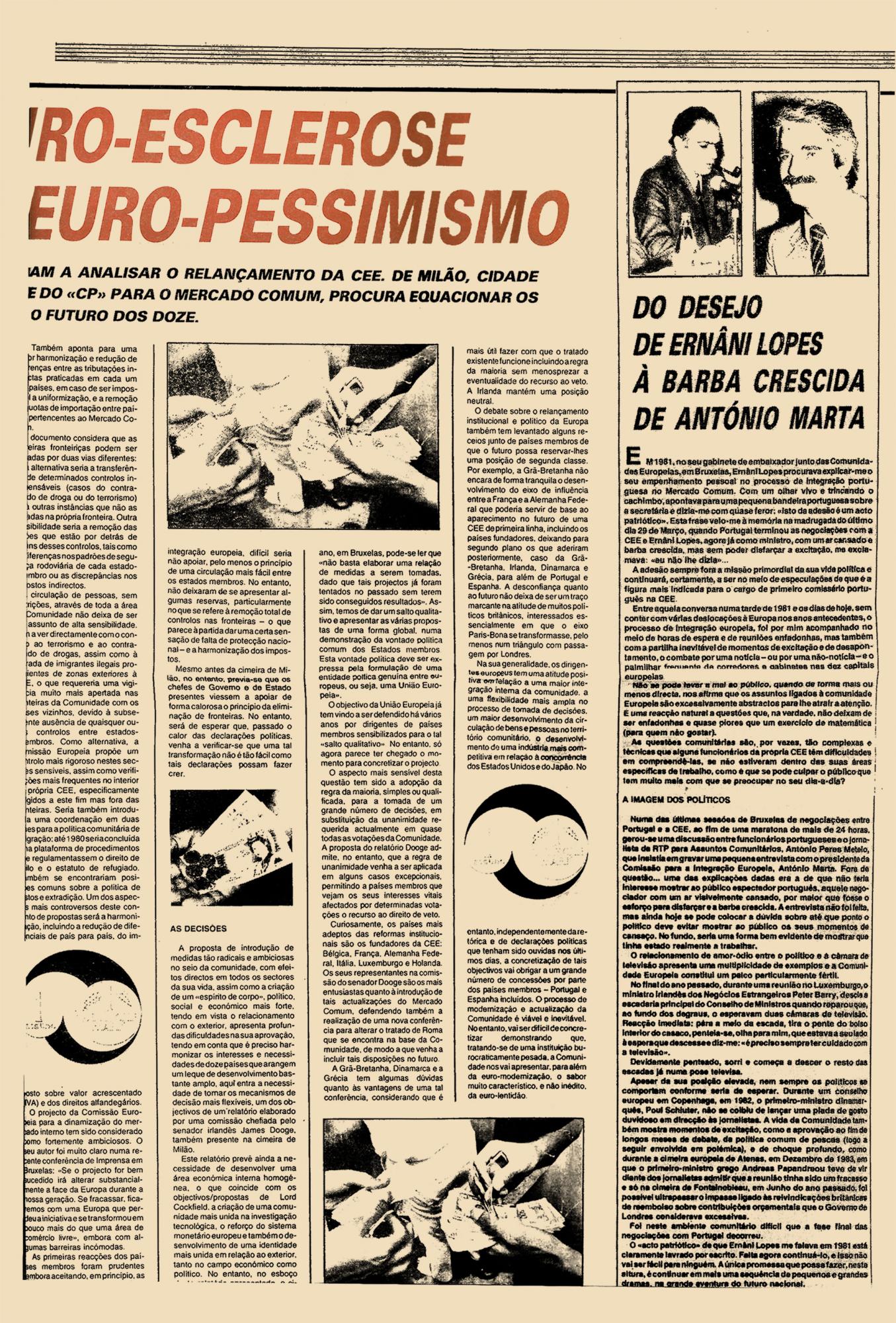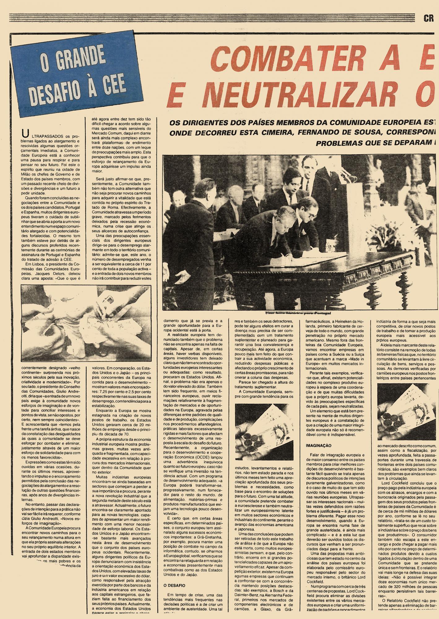 Os dirigentes dos países membros da comunidade europeia estão a analisar o relançamento da CEE. De Milão, cidade onde decorreu esta cimeira, Fernando de Sousa, correspondente do “CP” para o Mercado Comum, procura equacionar os problemas que se deparam no futuro dos doze.
