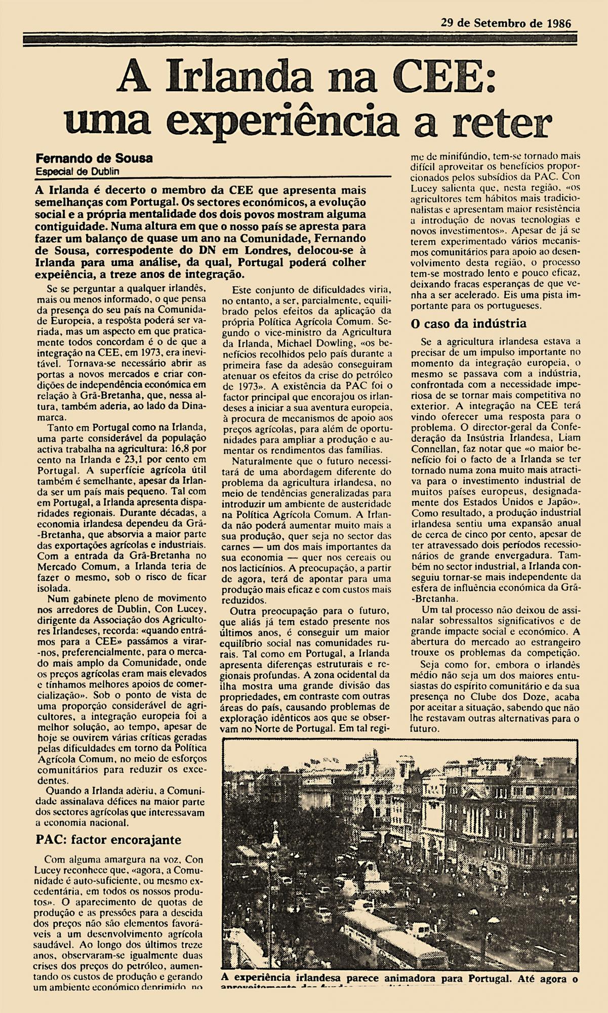 A Irlanda è decerto o membro da CEE que apresenta mais semelhanças com PORTGAL. Os sectores económicos, a evolução social e a própria mentalidade dos dois povos mostram alguma contiguidade. Numa altura em que o nosso país se apresta para fazer um balanço de quase um ano na Comunidade, Fernando de Sousa, correspondente do DN em Londres, deslocou-se à Irlanda para uma análise, da qual, Portugal poderá colher experiência, a treze anos de integração.